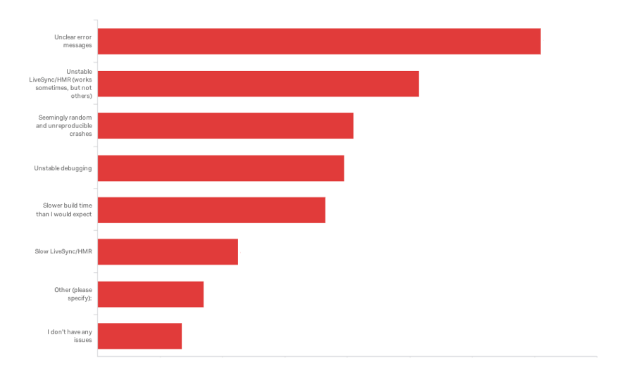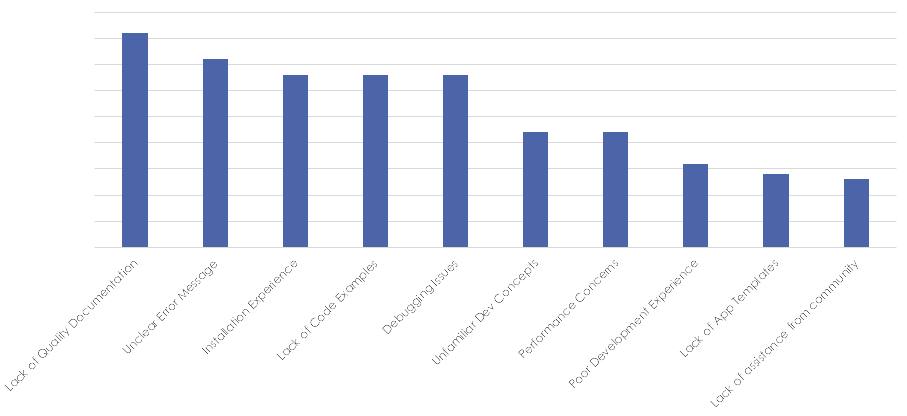 Talking about problem areas when getting started with the technology, we are seeing a great progress. "Installation Experience" was a long time winner in this not-so-prestigious competition. This time it falls down to #3 and we are happy that the effort the team put in providing a smoother getting started experience when it comes to setting up the environment is showing good results. Next priorities in this area would be "Lack of Quality Documentation" and "Unclear Error Messages".