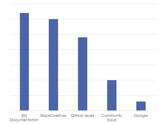 The getting started experience is showing improvement of 8% compared to last year. We are happy to say that the effort we put to provide quick hands-on experience with the technology through the NativeScript Playground and the tns preview command is being appreciated. An interesting finding here is that more than half of the people found out about NativeScript through some kind of content. Word of mouth is also a strong driver of new users and those three combined account for more than 75% of the new users. Have that in mind when you wonder next time how you can make {N} even more successful!
